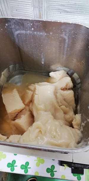 3.晒(さらし)の袋を4〜5枚用意し柔らかくなった脂を、その袋の中に入れて4〜5回濾し大きなゴミを取り除きます。